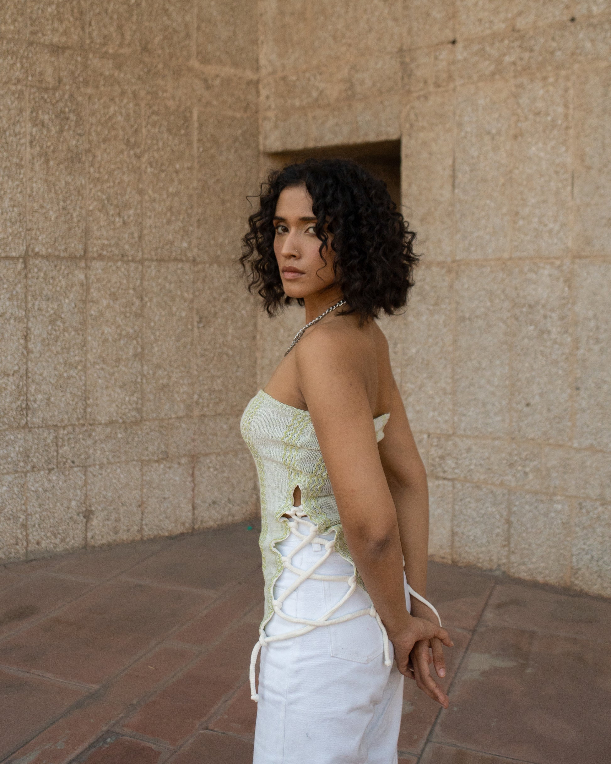 A fitted tube top with slits on both of the sides, combined with our signature criss-cross detailing. The slits can be loosened and tightened accordingly.